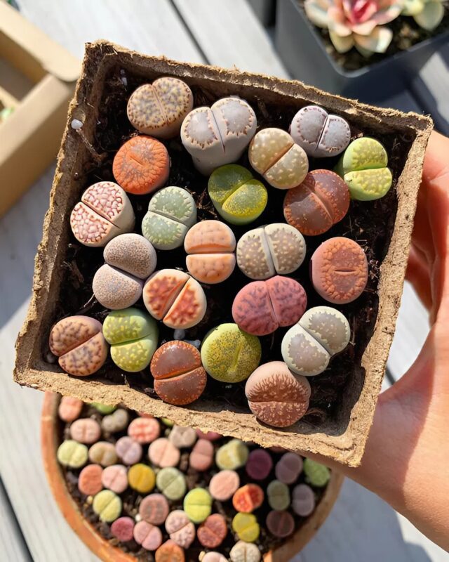 She smiled, kneeling beside the bucket like a proud mother showing off her children. “They’re Lithops — also called ‘living stones.’ They’re plants that look like pebbles. I brought them from Namibia.” 🌵✨